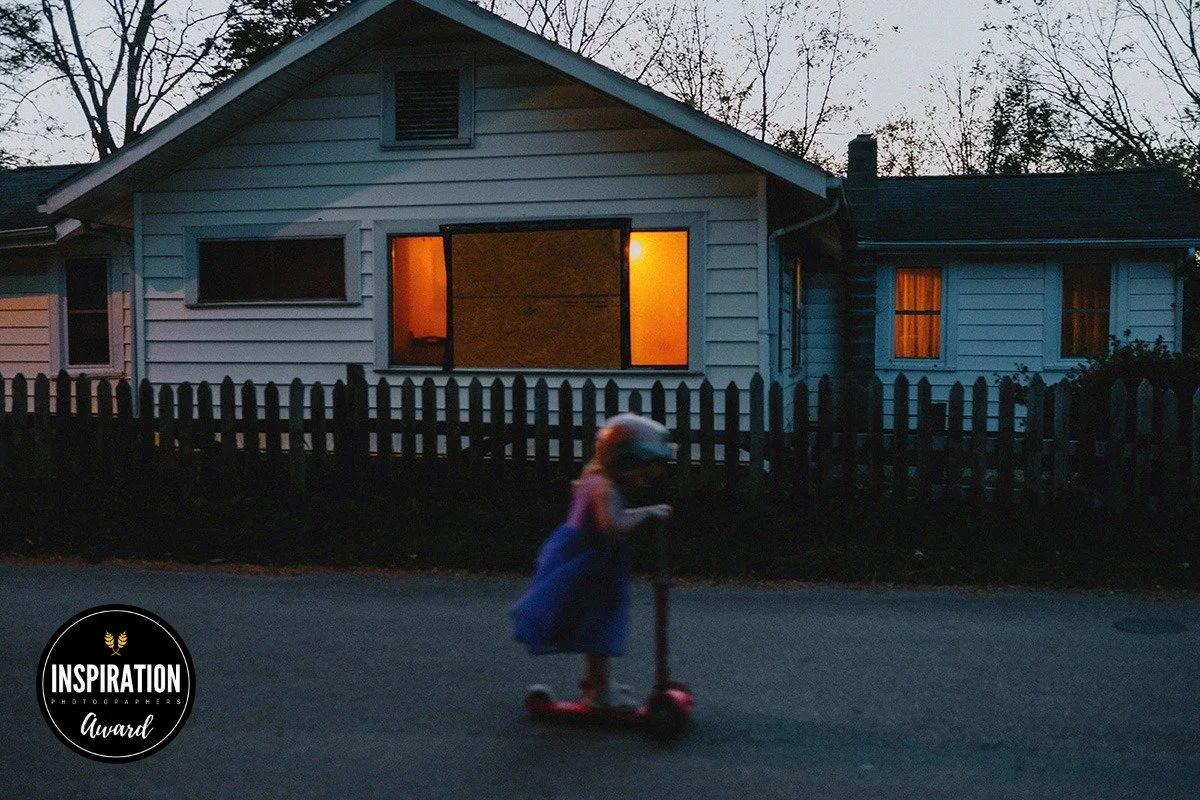 This award-winning frame captures the hush of dusk: a child in a helmet zipping past on a scooter, motion-blurred against the stillness of a white house whose warm, amber windows glow like pockets of home. The low light, shallow focus, and candid timing emphasize the quiet magic of everyday evenings — the small journeys children take as routine becomes memory. As one of my Inspiration Family Photography award images, it reflects the honest storytelling at the heart of my work and why clients seek Asheville family photography and Asheville documentary photography. If you’re looking for authentic, award-winning documentary family photography in Asheville or beyond, this image shows how I capture real life with emotion and atmosphere.