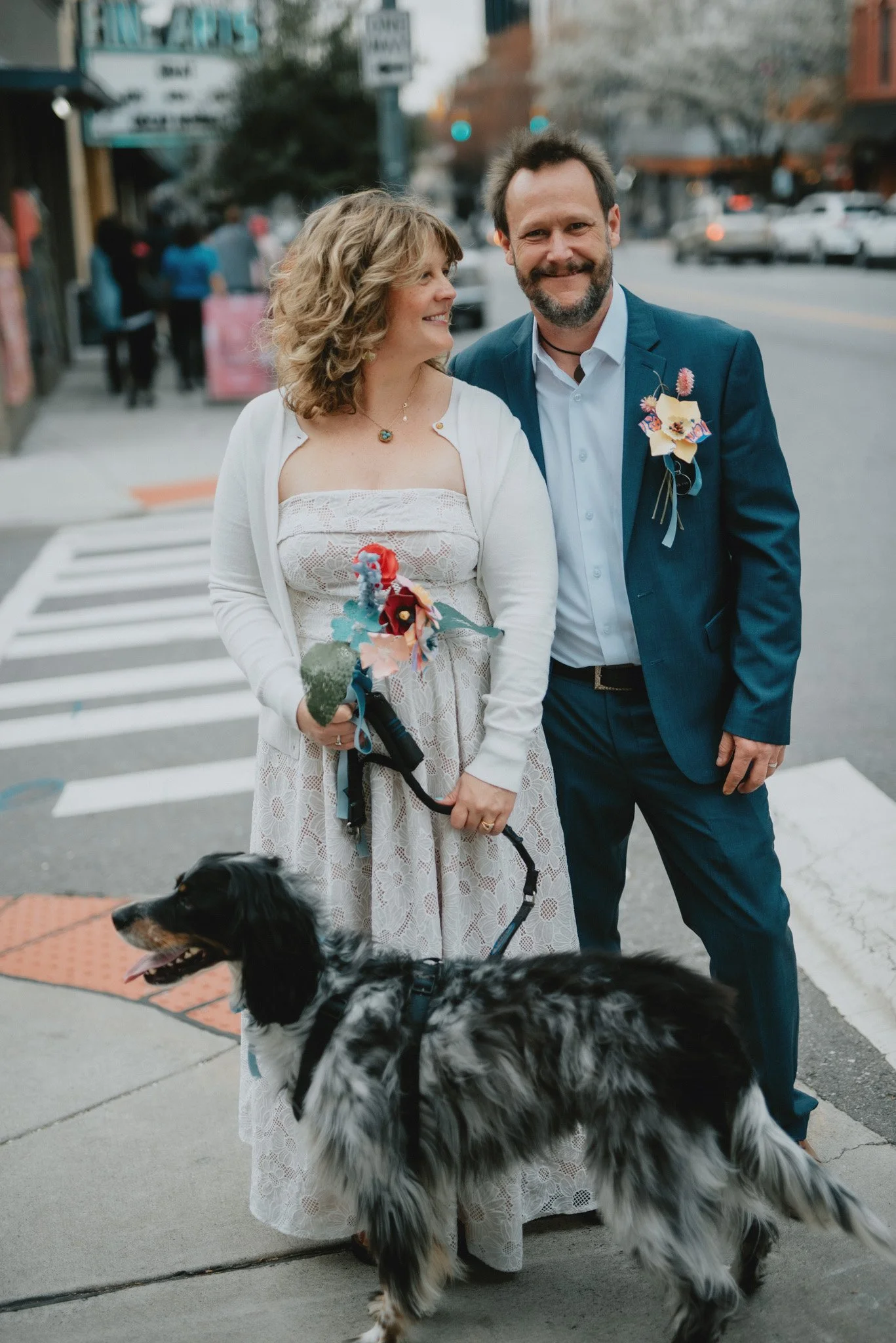 Abby and Jamie and their dog stand on a corner in downtown Asheville, North Carolina on their elopement day.
