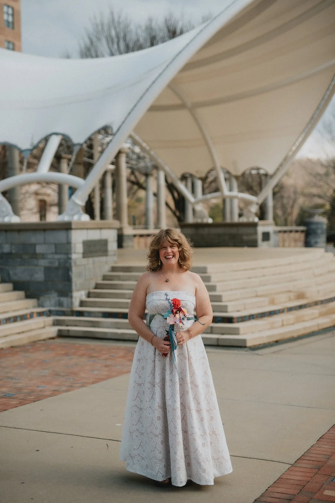 I was excited to get a few shots of the couple in front of the courthouse, where earlier that morning they were married. The courthouse in downtown Asheville, North Carolina, directly next to Pack Square, is a gorgeous building, and I love how those blue windows look like on Portra Film! We then strolled around, dropping by Pack Square, making photographs in front of the Asheville Art Museum and then walking down to the tiny, hidden Triangle Park. We managed to complete the photo shoot the very minute the rain began to fall. Between the exploding pink and white cherry blossoms, the beautiful soft blues of the sculpture in front of the art museum and the raindrops, we got a complete taste of spring in Western North Carolina.