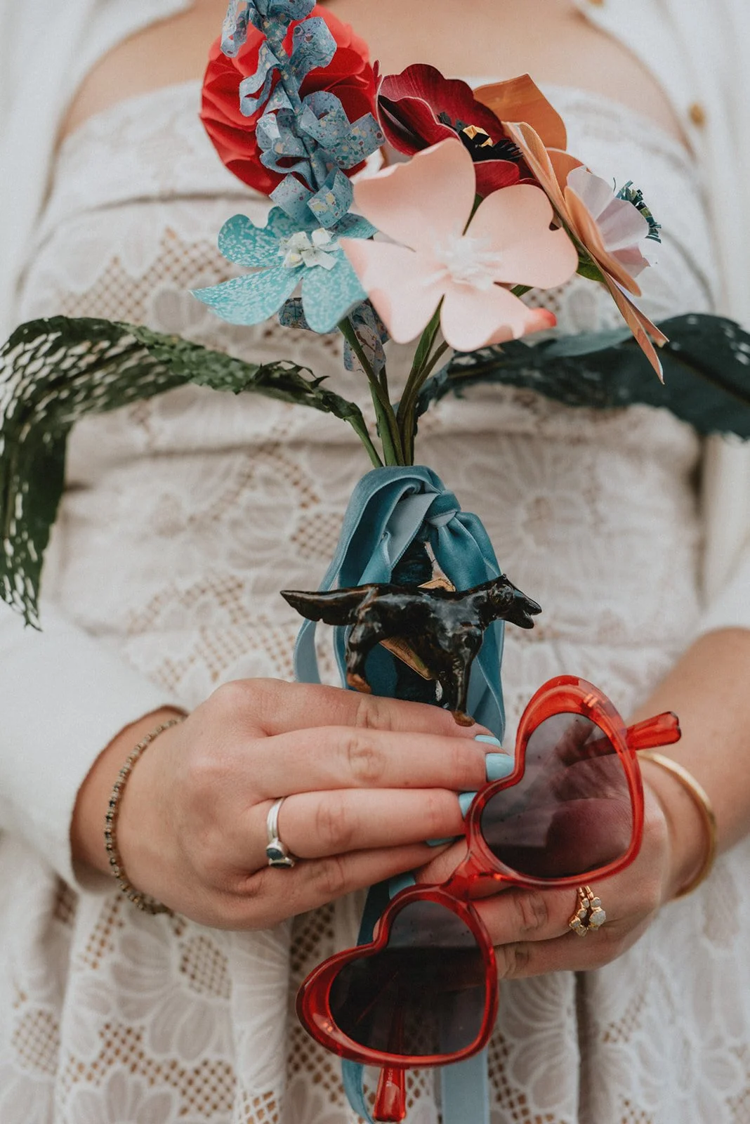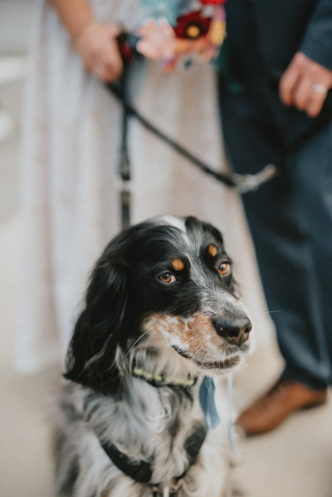 Details in the bride’s bouquet honor their beloved dog who died exactly one year ago on their elopement date.