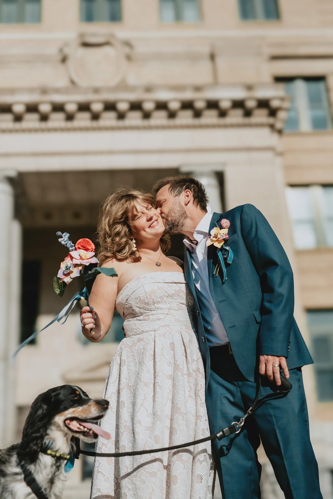 Jamie and Abby and a very proud dog eloped downtown in Asheville, North Carolina.